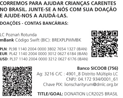 A Lions Charity Run nasceu em 2013, idealizada por Mariusz Szeib PhD, empresário de Poznan, na Polônia. Desde então, tem contado com o apoio de nomes importantes como Lech Wałęsa, Antonio Tajani e Roberta Metsola. Nenhum dos corredores é profissional. São arquitetos, empresários, professores, médicos — pessoas comuns que se colocam à disposição do extraordinário: servir por meio do esportProgramação em São Paulo